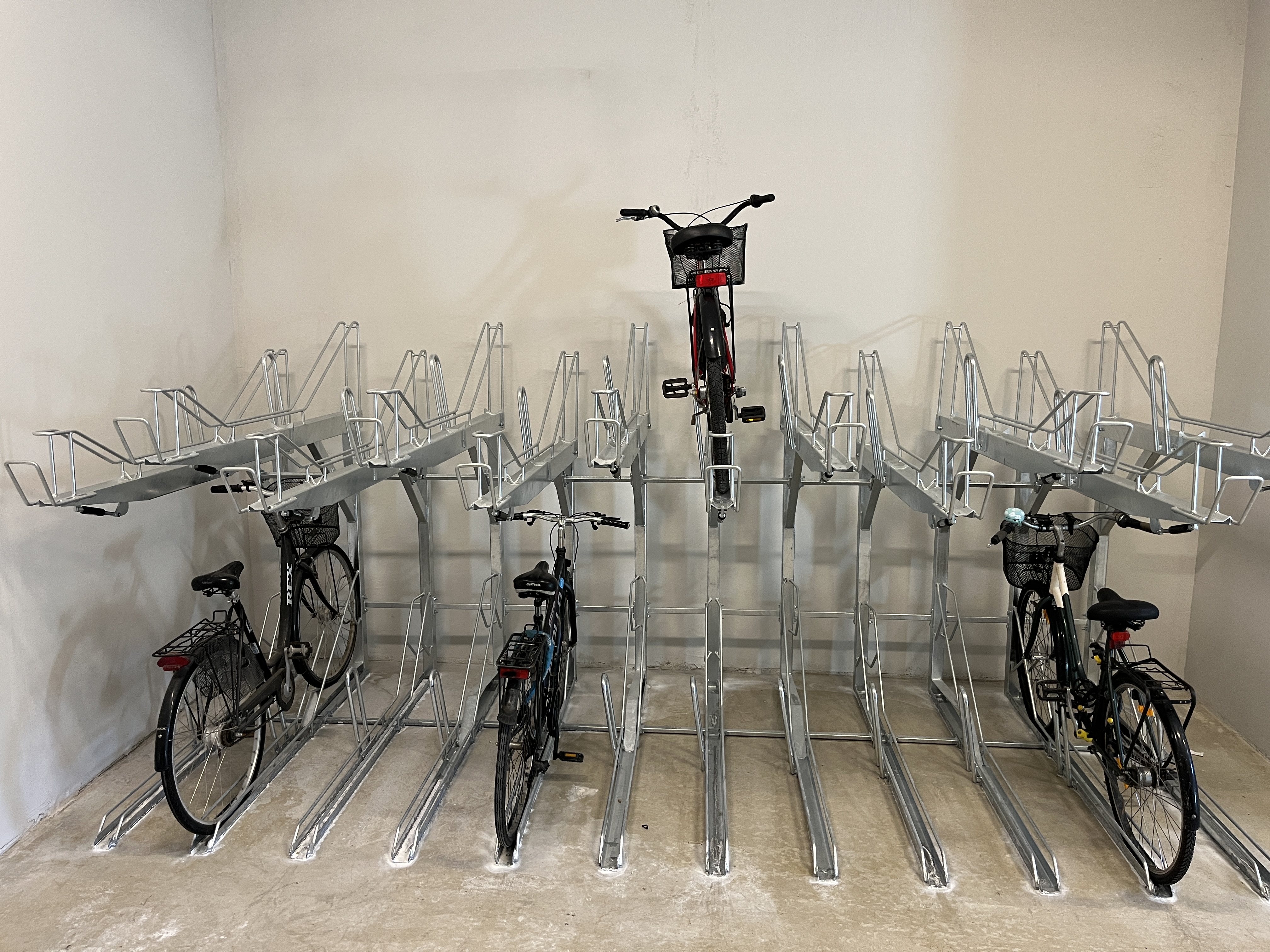 2-våningsstället STANDARD med utdragsskena och ramlåsningsbygel. Dessutom ett antal platser för låd- och lastcyklar.